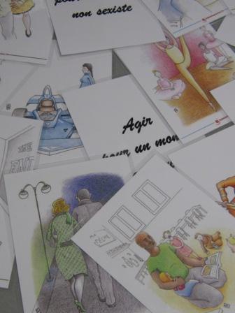 - A partir d’un photo-langage (dessins représentant différentes situations pour aborder les thèmes des stéréotypes et de l’égalité fille/garçon), les élèves doivent choisir en silence, une image qui les choquent ou les interpellent.